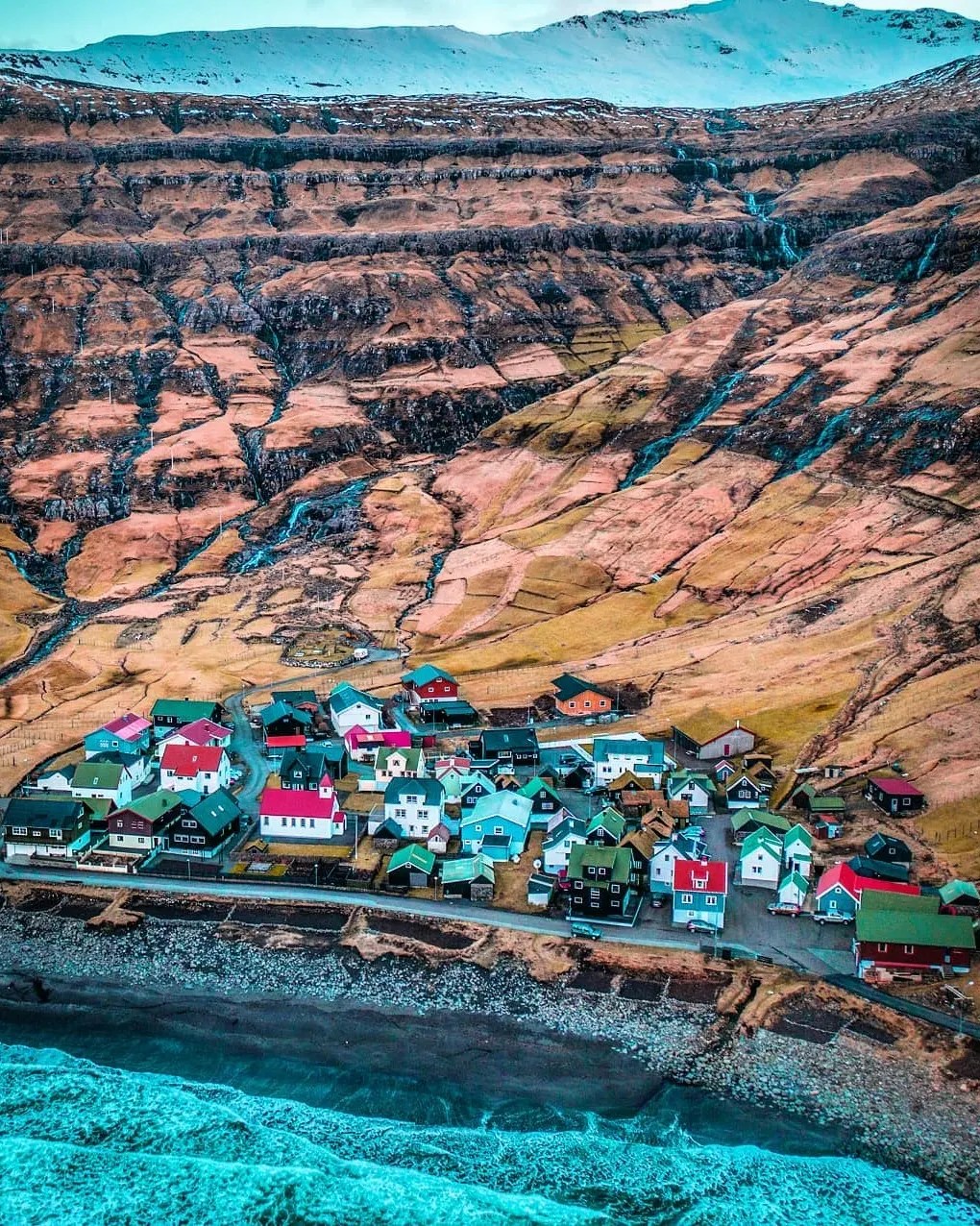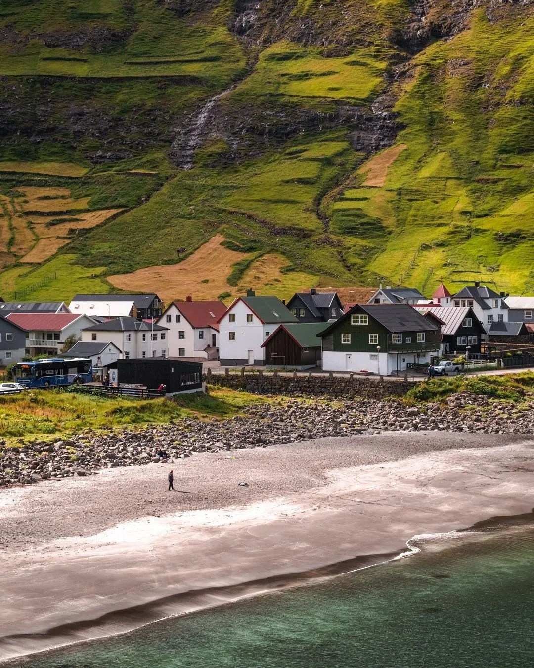 There is a lovely beach which is the most popular surfing spot in the Faroe Islands and the houses are nestled along the beach.