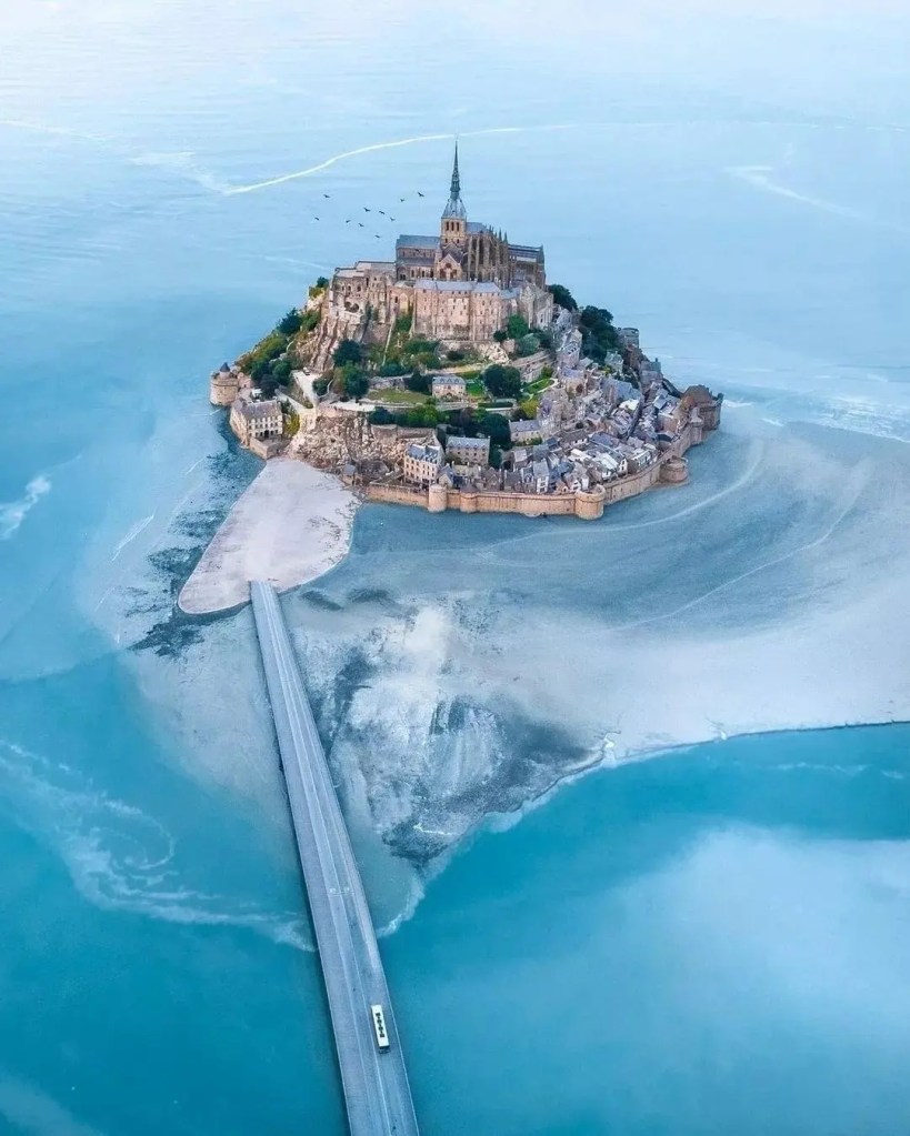 Mont-Saint-Michel is a tidal island and mainland commune in Normandy, France. The island lies approximately one kilometre off the country’s north-western coast, at the mouth of the Couesnon River near Avranches and is 7 hectares in area.